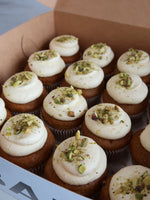 kaurajuoma (vesi, gluteenitonkaurajauho(10 %), kasviöljyt (rapsi ja rypsi), happamuudensäätöaine (kaliumfosfaatit), kalsium, suola, jodi, vitamiinit (riboflaviini (B2), B12 ja D2)), sokeri, rapsiöljy, laktoositon voi (pastöroitu kerma, suola), Philadelphian Laktoositon Original (maito, kerma, suola, stabilointiaineet (johanneksenleipäpuujauhe), hapate), tomusokeri (sokeri, paakkuuntumisenestoaine (trikalsiumfosfaatti)), porkkana, omenaviinietikka, pistaasipähkinä, leivinjauhe (E450, E500, maissitärkkelys), suola, nostatusaine (natriumbikarbonaatti), kaneli, kardemumma.